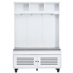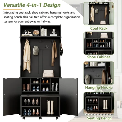 - Integrating coat rack, shoe cabinet, hanging hooks and seating bench, this hall tree offers a complete organization system for your entryway or hallway. No matter where it is placed, with this all-in-one furniture piece, you can meet a variety of storage needs in one compact design.: