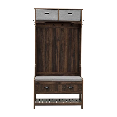 Transform your entryway with this multifunctional hall tree featuring: ? MDF construction with Brown finish ? Spacious 33.5L x 16.5W x 68.9H dimensions ? All-in-one organization with storage cabinets, drawers and hooks ? Weight capacity up to 68.34 lbs for durable performance Ideal for keeping entryways, mudrooms and living areas clutter-free. Features anti-tip safety design and comes with complete assembly hardware.
