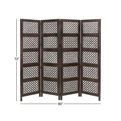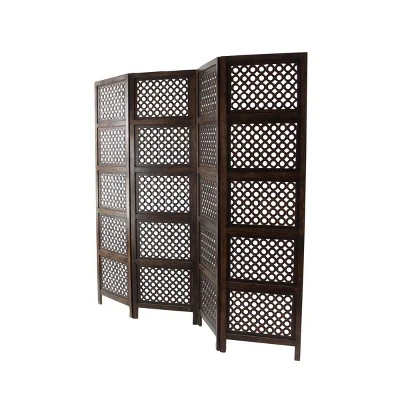 This 4-panel room divider is see-through because of the traditional carvings. Still, it can provide privacy with the addition of curtains or Japanese paper. Designed with felt or rubber stoppers at the base that prevent scratching furniture and table tops, as well as sliding around. This item ships in 1 carton. Due to the handmade nature of this item, no two will be alike, there will be slight differences in shape, size, and color. Suitable for indoor use only. This item ships fully assembled in one piece. Made in India. Item features 4 panel screens. This is a single brown colored folding panel partition. Traditional style.