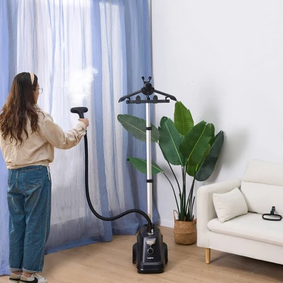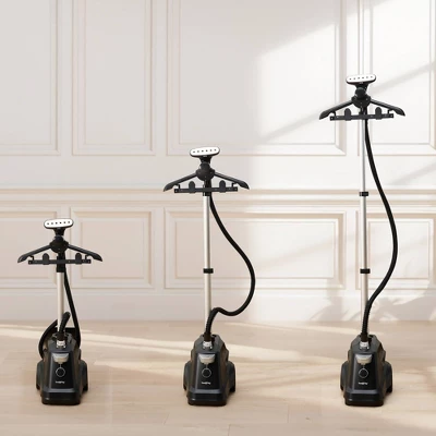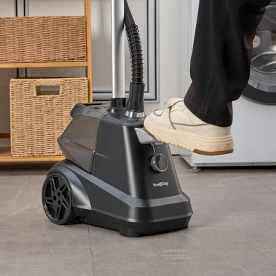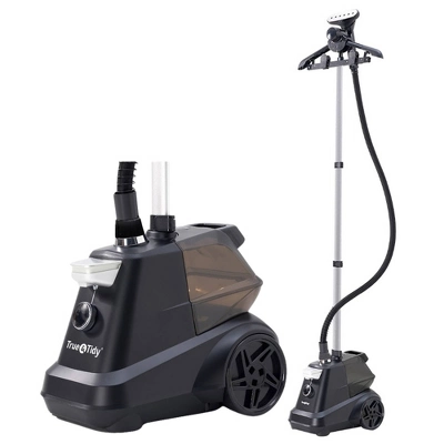 The True & Tidy® SX3 Pro Commerical Garment Steamer boasts a powerful 1800 watts of steam that is great for both residential and commercial use. It features a dual-insulated woven hose with a brass connector, an aluminum plated steam nozzle, and wheels for easy mobility. The extra large 3 liter capacity water tank allows over an hour and a half worth of steam time, while the foot pedal power control conveniently turns the unit on and off with only a tap of the foot. With it’s easy-to-use dial, steam settings can be adjusted between 3 levels to steam a variety of fabrics. The 360 degrees swivel hanger with hanger clips is great in securing up to 6 garments at the same time. The SX3 Pro Commerical Garment Steamer is perfect for steaming through your business or for handling the family’s laundry day!