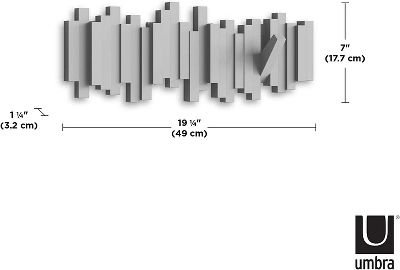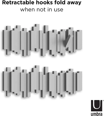 Keeping entryways with all the coats and accessories neat and organized is always a challenge, especially in small spaces. Transform your entryway into a tidy and stylish space. Introducing Sticks Multi Hook by Umbra ticks Multi Hook is a sculptural and yet functional wall coat rack that will provide you with ample hanging space in virtually every area of your home, office or dorm room. This versatile and decorative coat hanger accommodates all your personal hanging needs such as coats, scarves, purses, umbrellas, bathrobes, towels, accessories or even light weighted cleaning tools like brooms, sweepers & more. The deceptive design of Sticks looks at first glance like a modern piece of art until it boasts its clever design with 5 flip-down hooks which can be flipped up when not in use, creating a clean, seamless profile that is great for tight spaces or minimalist decor styles. Each flip-hook holds a surprisingly 5 lbs. load per hook making it a strong helper to keep your home better organized. Available in a range of finishes, this coat rack constructed of molded plastic with 5 flip down hooks measures Available in a range of finishes, this coat rack constructed of molded Plastic with 5 flip down hooks measures 19 1/2 x 7 1/4 x 1-inches. Stick comes with mounting hardware making installing it super easy and fast. The hidden mounting hardware gives this contemporary coat rack a seamless, floating look. Order Sticks Multi Hook today and start organizing and decorating your home with this eye-catching modern design. From the Designer David Quan: I designed this product after the many house parties I attended where there was never enough space to hang jackets. About Umbra: A global product design company providing original, modern, casual, functional, and affordable design for the home.