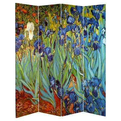 Bring a dramatic splash of color and some fine art appreciation into any interior with the Van Gogh Fine Art Double Sided Room Divider Starry Night and Irises from Oriental Furniture, a 4-panel decorative screen that stretches 6′ high and displays 2 Vincent Can Gogh masterpieces: “Starry Night” and “Irises,” which offer a contrast of daytime and nighttime scenes.