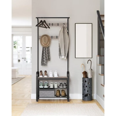 - [4-in-1 Hall Tree] Combining a hanging rod, a shoe bench, a shoe rack, and coat hooks, this all-in-one freestanding coat rack offers you convenient storage for your coats, shoes, and on-the-go items and a seat to change shoes