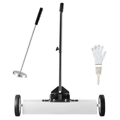 Ease of Use: After attracting magnetic objects, simply lift and release the handle for quick debris disposal. All collected metal particles will immediately drop, allowing for swift cleanup. The 6.89-inch rubber wheels are height-adjustable from 0.9” to 2” (22.86 – 50.8 mm), making the magnet sweeper easy to maneuver over gravel and grass surfaces. It includes a brush and gloves for added convenience.
