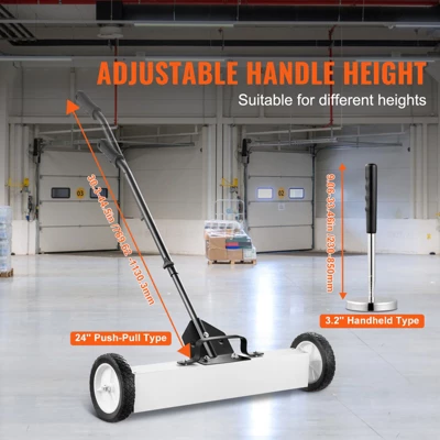 Superior Magnetic Power: The VEVOR magnetic sweeper with wheels includes a 24” magnetic sweeper with wheels and a 3.2” telescoping magnetic pickup tool, capable of holding up to 50 lbs (24”) and 35 lbs (3.2”) respectively. It effortlessly collects nails, screws, and black metal debris, protecting you from shards and sharp metals.