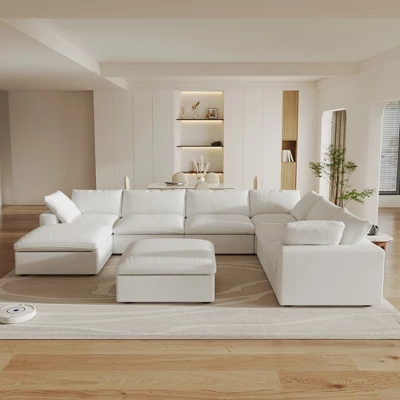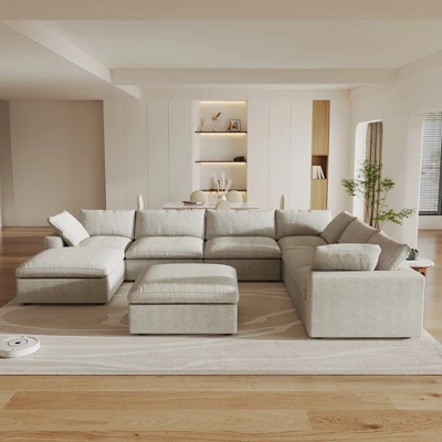 Please!!! [Put the Sofa Covers] the sofa item is the gray color when you open the boxes, But, please do not worry, all seat need to be put the sofa covers then will become right color. The Skycloud sofa is designed to provide “cloud-like comfort.” Its filling combines sponge, cotton, and down in the perfect ratio, making it soft yet resilient, which ensures comfort without sagging. The Skycloud sofa also has a modular design: you can freely combine the seats, arrange or remove the arm cushions, and choose from three modules: corner, armless, and ottoman. These features offer endless possibilities for arrangement. The Skycloud sofa is designed to provide “cloud-like comfort.” Its filling combines sponge, cotton, and down in the perfect ratio. Thanks to this filling, the Skycloud sofa is soft yet resilient. In addition, the Skycloud sofa is highly modular: you can freely combine the seats, and arrange or remove the arm cushions. Besides, you can choose from three modules: corner, armless, and ottoman. These features offer endless possibilities for arrangement. BY other word: Elevate your living space with this expansive this cloud sofa, designed for ultimate comfort and versatility. The sofa features a sturdy solid wood frame, ensuring durability and long-lasting support. Upholstered in premium hemp-blend fabric, it offers a dense yet soft texture, combining wear resistance, moisture resistance, and a static-free experience. The feather-filled cushions provide a plush, cloud-like seating experience, while the modular design allows you to customize the layout to suit your space. The included convertible ottoman adds extra functionality, perfect for lounging or additional seating. For added convenience, the removable and washable covers make maintenance a breeze. With its generous seating width and depth, this sofa offers ample space to stretch out and relax, making it the perfect centerpiece for your home. Upgrade your comfort with this stylish and practical sectional sofa today!
