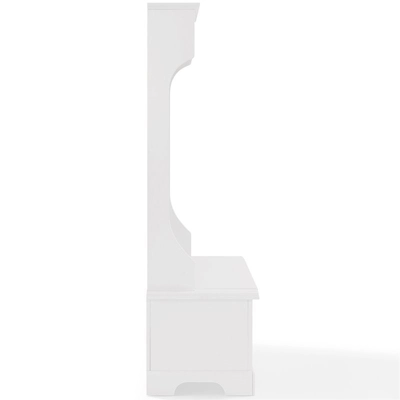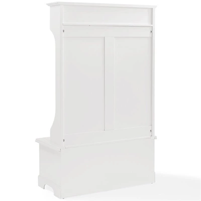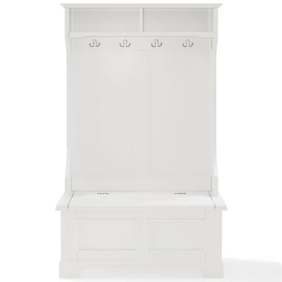 Enliven your entryway or add function to any foyer with the Hall Tree. Raised detailing and genuine metal hardware maintains traditional appeal and matches. Four double hooks offer plenty of storage for coats, umbrellas, and keys. The large storage bench offers a place to sit and a spacious area below to stow blankets, jackets, and accessories. Two cubbies at the top provide the perfect place for shoes or other small items. The Hall Tree is the classic focal point you’ve been looking for. Features: Finish: WhiteMaterials: Hardwood and VeneerSolid Hardwood & Wood Veneer Construction Four Double Hooks for Hanging Accessories Bench Seat Lifts to Reveal Extra StorageTwo Upper Storage CabinetsGenuine Metal HardwareEasy to AssembleSpecifications:Overall Product Dimensions: 64.25″ H x 40″ W x 18.5″ DProduct Weight: 83 lbs