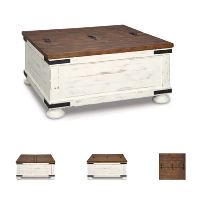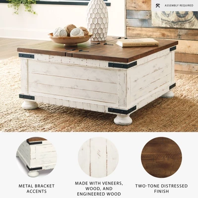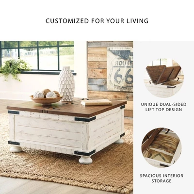 Double take. Sporting a two-tone finish, dual-sided lid design and expansive storage space, this square coffee table takes the art of rustic farmhouse living to a new level. Designer touches include plank-effect styling, heavy distressing and industrial bracket hardware. Signature Design by Ashley is a registered trademark of Ashley Furniture Industries, Inc.
