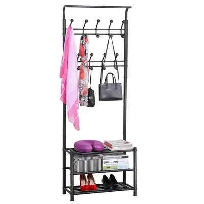 - Multifunctional Rack: The 3-in-1 hall tree is a perfect combination of clothes hanging rack, hooks and storage shelves. It provides 18 hooks for coats, dog leashes, 3 open shelves for backpacks, shoes and 1 top rod for lighter items like scarves, umbrellas.