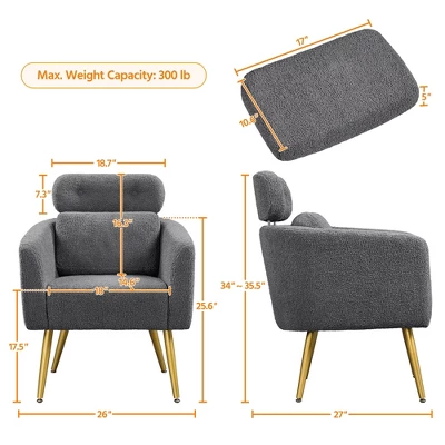 - Choose this boucle barrel accent chair with adjustable headrest. It’s made of a solid & manufactured wood frame, sturdy metal legs and durable boucle upholstery, providing excellent sturdiness and durability. This side chair provides a cozy seating experience with a cushioned back, seat, adjustable headrest, and lumbar pillow for maximum comfort. The combination of rich-textured boucle upholstery and splayed golden legs adds a touch of glam and personality to your home or office. The compact size and lightweight design make this bedroom chair ideal for living rooms, bedrooms, apartments, studios, offices and more.
