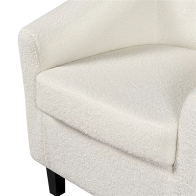 - The contemporary with traditional curved design merge for an elegant look, this boucle club chair set is an inviting addition to any seating ensemble. Boucle fabric upholstery made from 100% polyester with ivory tone covers the accent chair set, adding texture and elegance to your home. Built with a wooden frame and supported by solid wood legs, the accent chair can support 300 lb, and the ottoman is capable of holding 243 lb. The seat is designed with a generous sitting area and filled with thick foam for utmost comfort, and the curved back perfectly supports your body. An ottoman is accompanied with this club chair, allowing you to put your feet up and relax. This barrel chair set features an adorned silhouette and the barrel shape backrest perfectly blends with the semicircle ottoman, making it a good addition to the living room, bedroom, office, guest room, apartment and small spaces.