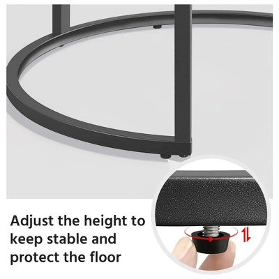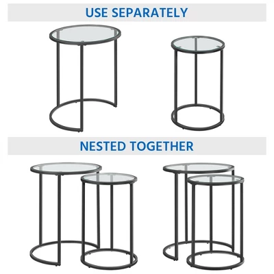 - These modern side tables feature a mustard gold/matte black finished iron frame with a nesting design that allows you to easily move the smaller end table into the other. The tabletop is built of strong tempered glass, which provides you a perfect place to display your favorite flower, family frame and other ornaments. Making cleaning a breeze, the iron frame is finished with powder coating for a longer service time, so you can simply wipe it clean using a clean, dry cloth. Ideal for the living room, bedroom, guestroom, office, apartment and small space.