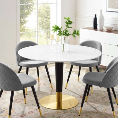 Gather family and friends for good food and conversation around the Zinque Dining Table. Bringing modern influence and mid-century inspiration to your dining space, this pedestal table reflects an organic shape. Perfect for entertaining or everyday dining, this dining table rests on a black and polished gold tapered base and features a round tabletop crafted with MDF and an easy-to-clean white coating. Non-marking ring to protect flooring. Assembly required.